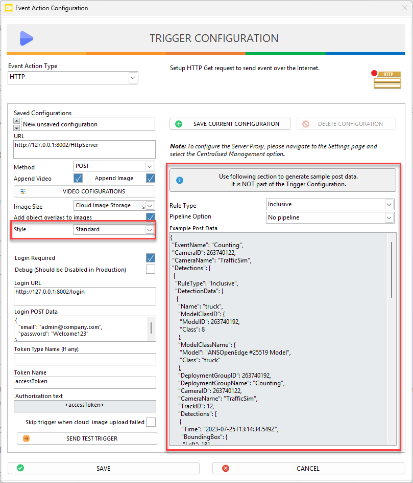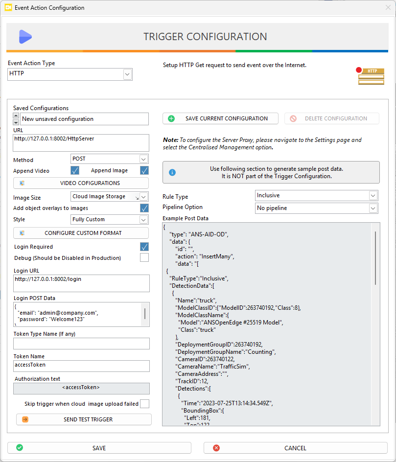 After finishing HTTP configuration, you can use the Send Test Trigger button to sends sample event data to the configured URL